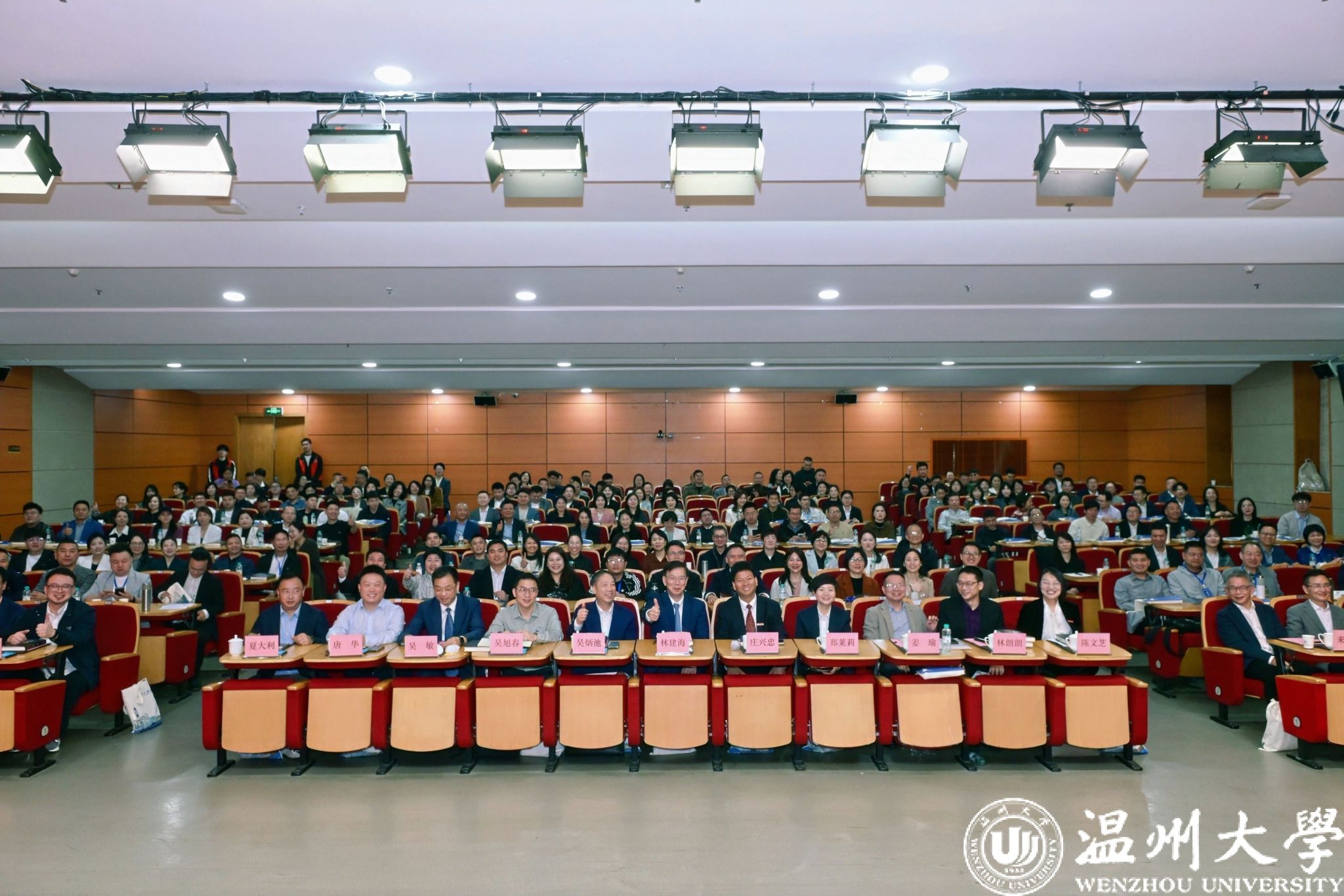 在全场嘉宾的共同见证下,国际货币基金组织原秘书长、温州大学客座教授林建海,温州大学党委副书记庄兴忠,温州大学经济与管理学院院长罗建利,温州大学经济与管理学院副院长、温州大学EDP中心主任陈文芝,温州市工商联宣教部部长吴旭春,正泰集团党委书记吴炳池,康奈集团总裁郑莱莉,温州大学经济与管理学院校友会秘书长林朗朗共同登台,以掌印点亮未来,宣告温州大学EDP中心正式启航。