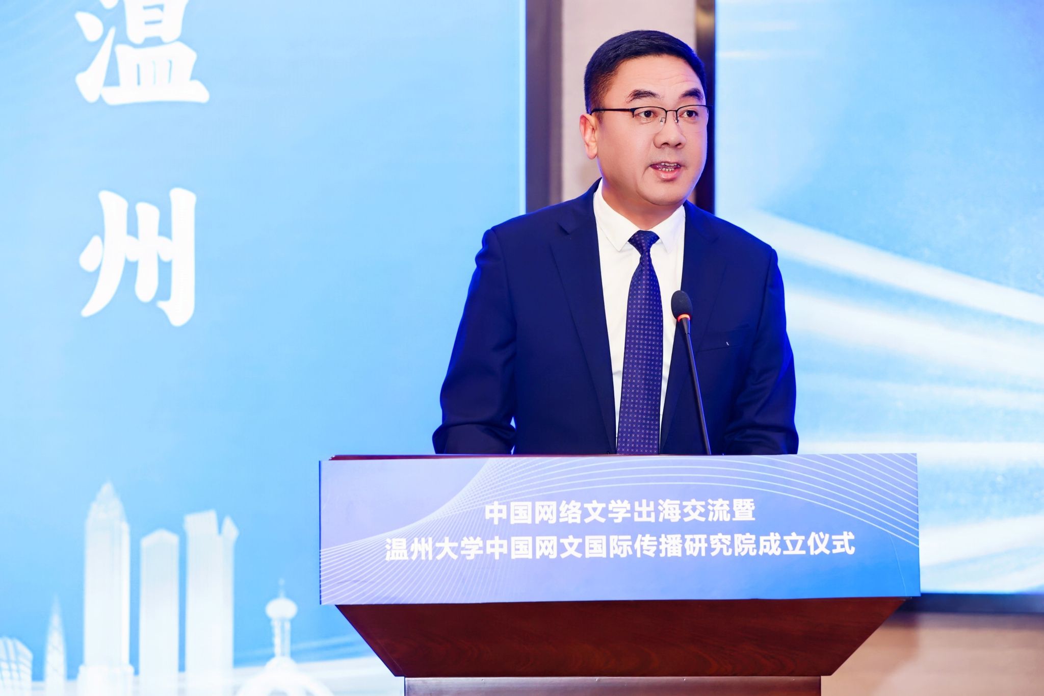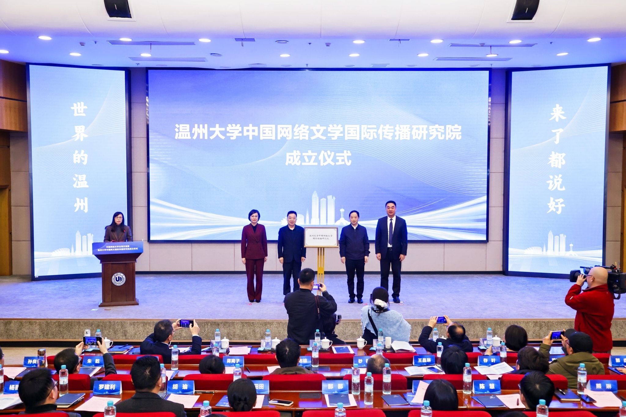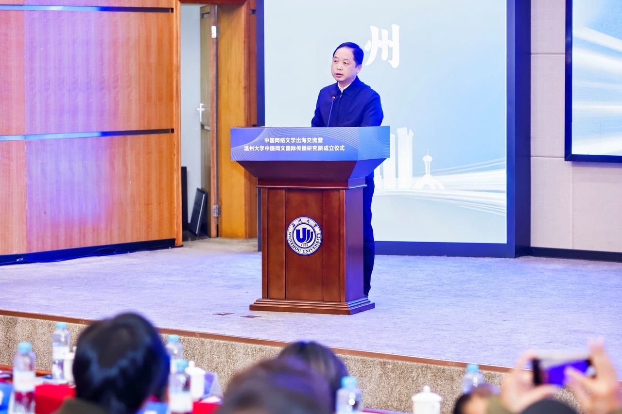 活动由中国作家协会、浙江省作家协会指导,温州市委宣传部与温州大学联合主办,旨在搭建高水平协作平台,全力推动网络文学成为讲好中国故事、传播中国声音的重要载体。活动现场,中国作协党组成员、书记处书记胡邦胜、浙江省作协党组书记叶彤、温州市委常委、宣传部部长王彩莲、温州大学党委书记钱强等领导出席活动并共同见证中国网络文学交流中心的落地与研究院的成立。活动由校党委委员、宣传部部长吴静主持。作为国家文化战略的重要践行者,温州大学始终以服务国家战略和地方发展为己任。早在2019年便前瞻布局,成立网络文创研究院,聚焦网络文学创作生态、产业发展与理论研究,集聚了一批高层次人才与青年学者,逐步构建起涵盖创作引导、学术研究、人才培养的协同体系。此次中国网文国际传播研究院的成立彰显出温州大学在网络文学领域的学术实力与引领潜力。