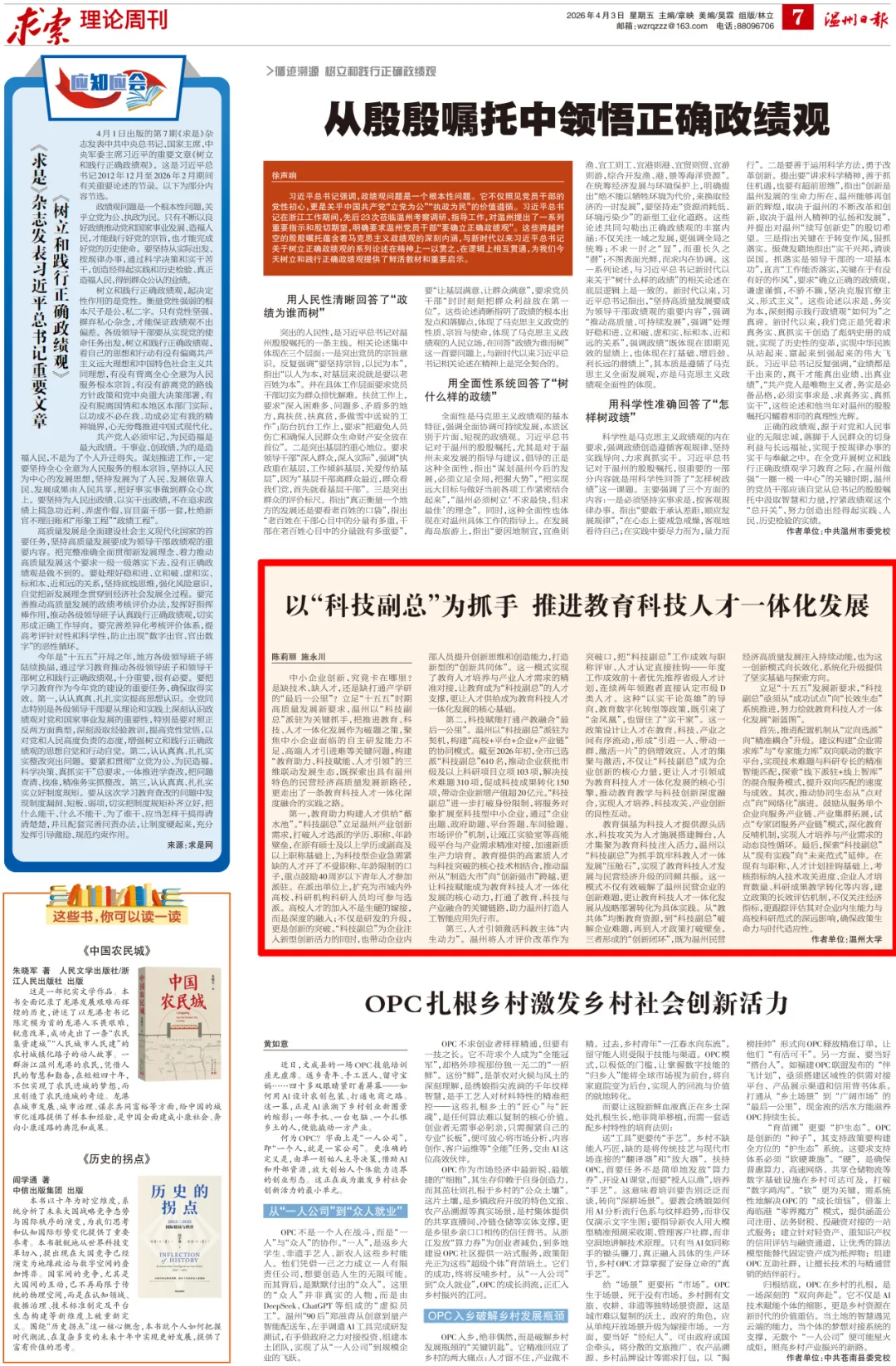 2026年4月3日,基地研究员施永川及其学生陈莉丽,在温州日报理论版刊发《以“科技副总”为抓手,推进教育科技人才一体化发展》一文。